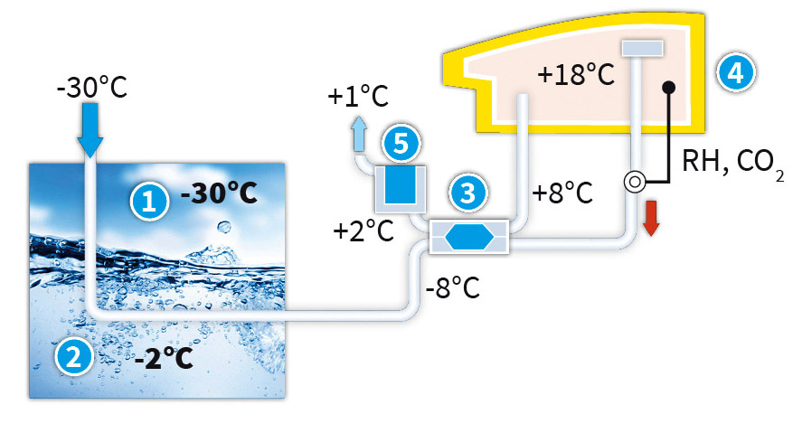 As the graph shows, the cold outside air (1) is first heated by the seawater (2). The counterflow plate heat exchanger (3) utilizes the higher temperature-controlled air from the cabin (4) and heats the incoming air so on. The sample calculation shows that from minus 30 degrees outside air and plus eight degrees on board. The remaining heat supplied by electrical energy that is generated by wind turbines on the pack ice.